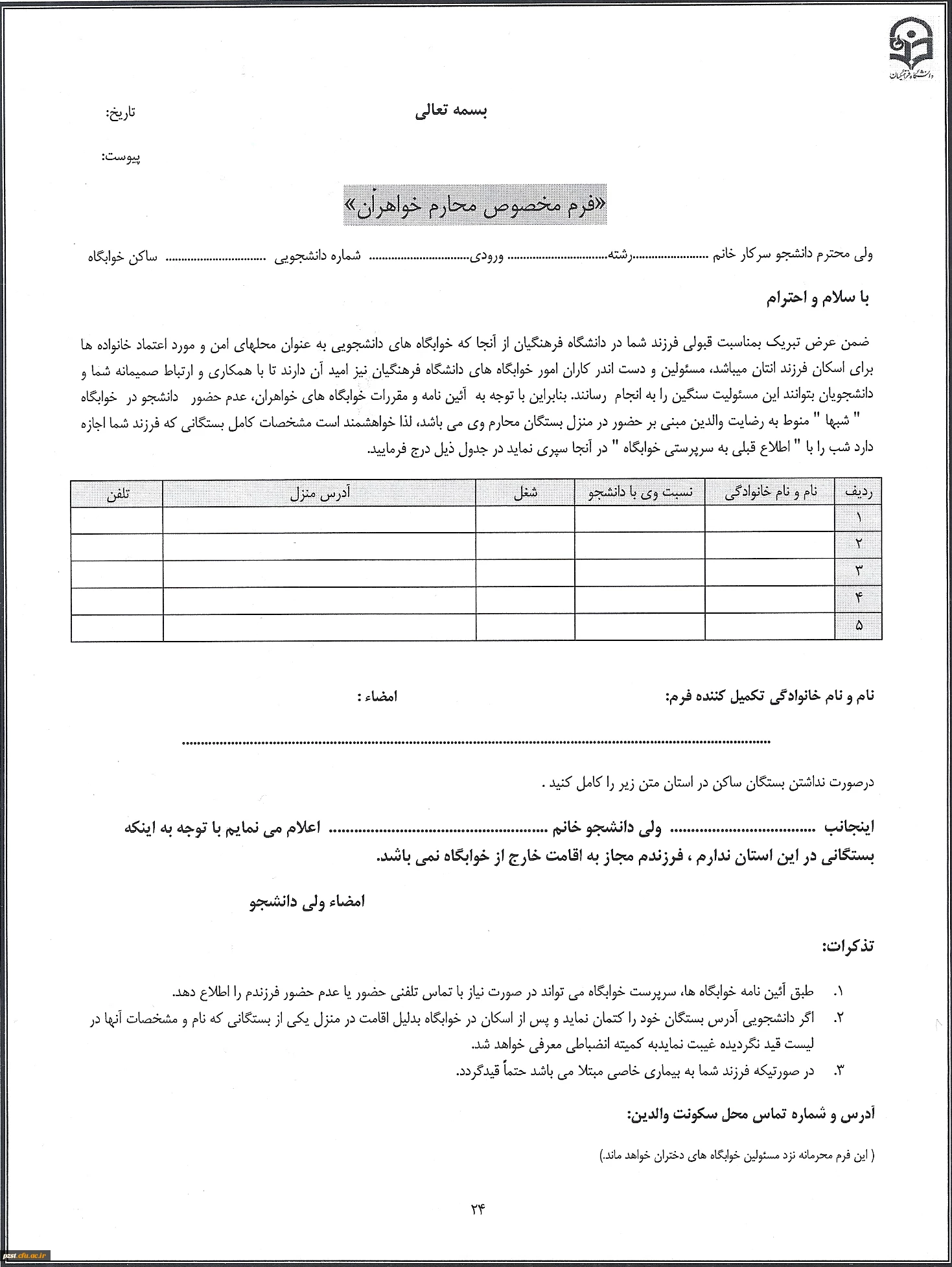 فرم محارم خواهران ( ویژه دانشجویان متقاضی خوابگاه)