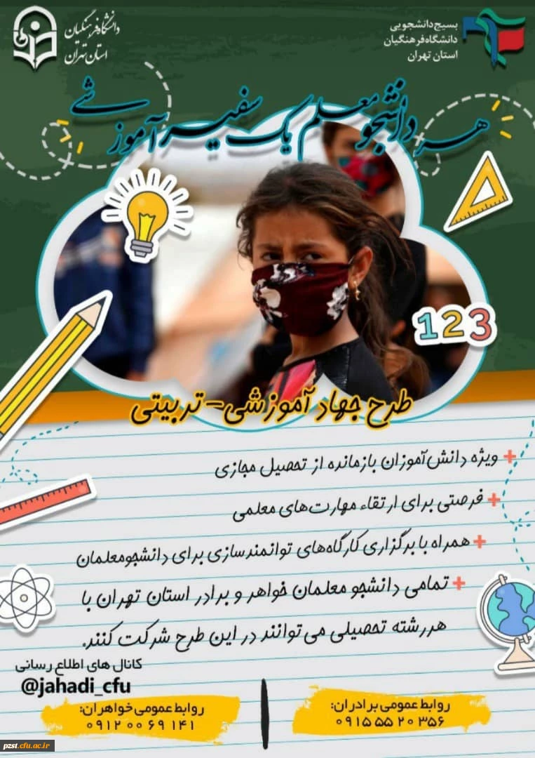 بسیج دانشجویی دانشگاه فرهنگیان برگزار میکند: طرح جهاد آموزشی _ تربیتی تدریس حضوری جهادی برای دانش آموزان بازمانده از تحصیل