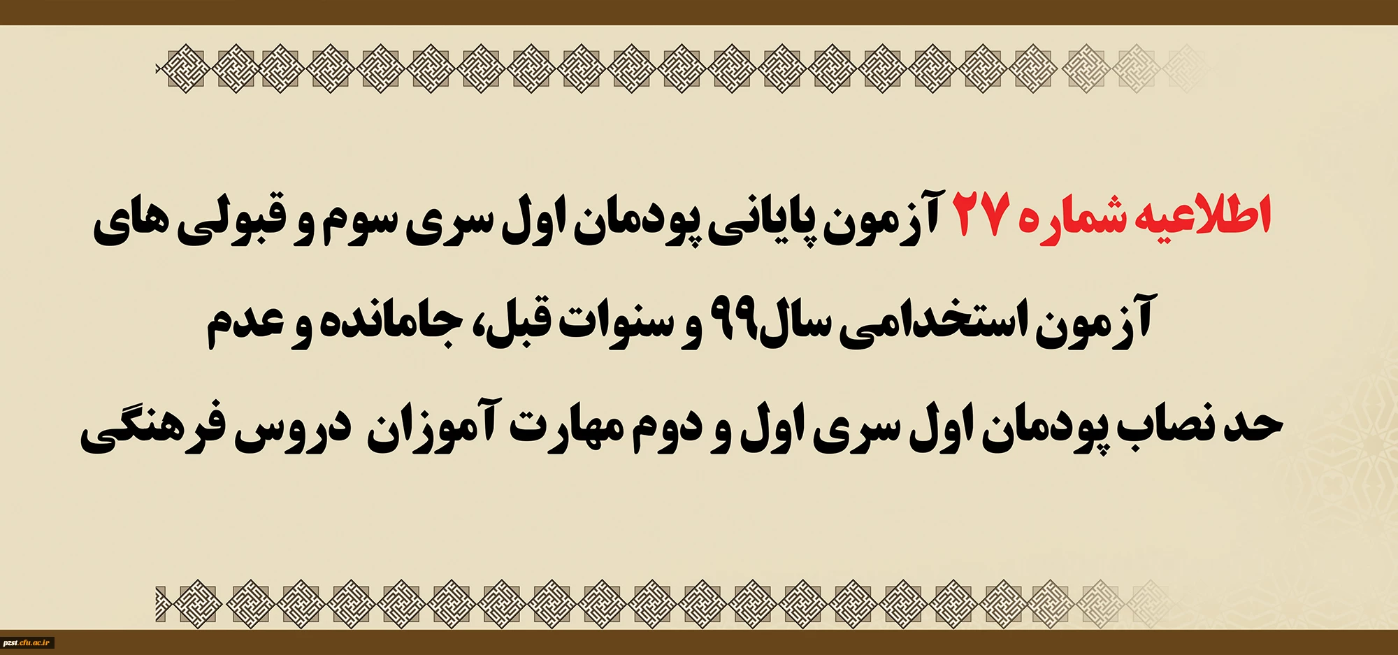 اطلاعیه شماره 27 آزمون پایانی پودمان اول سری سوم و قبولی های آزمون استخدامی سال99 و سنوات قبل، جامانده و عدم حد نصاب پودمان اول سری اول و دوم مهارت آموزان دروس فرهنگی