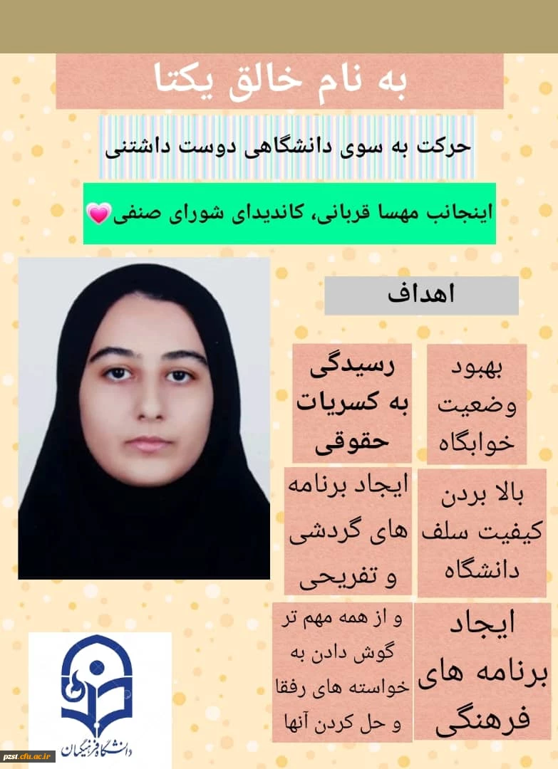 امتیاز دهید : اعلام اسامی و تبلیغات کاندیدای انتخابات شورای صنفی رفاهی - سال تحصیلی 1401-1400 2 یکشنبه 1 خرداد 1401 ساعت 10:32