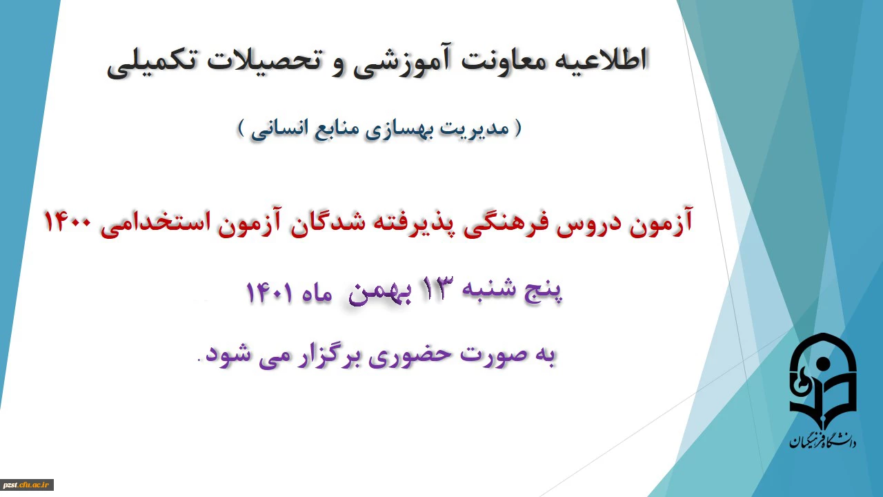 امتیاز دهید : برگزاری آزمون دروس فرهنگی پذیرفته شدگان آزمون استخدامی سال 1400 2 سهشنبه 11 بهمن 1401 ساعت 11:35