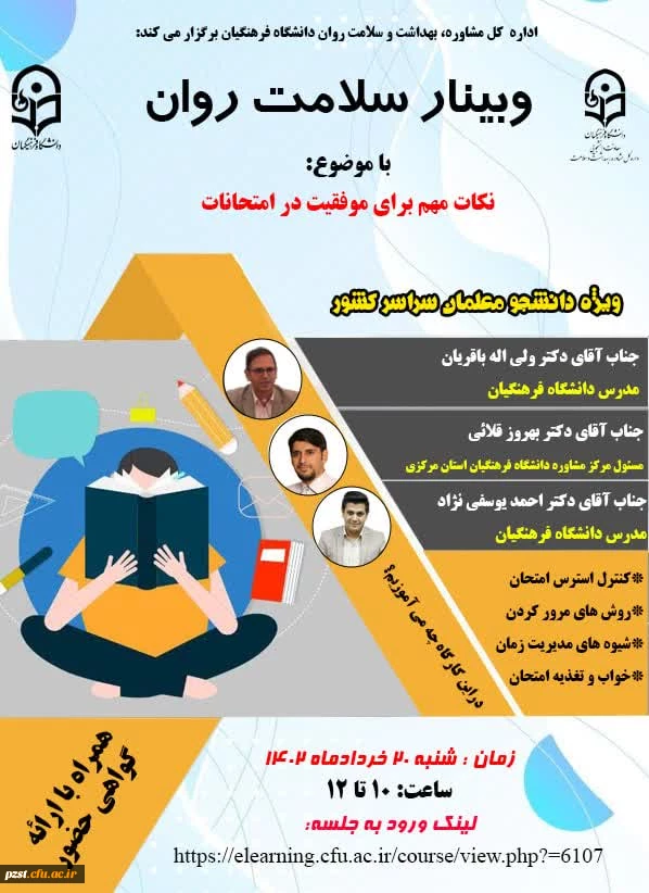 امتیاز دهید : برگزاری کارگاه آموزشی با موضوع نکات مهم برای موفقیت در امتحانات ویژه دانشجو معلمان چهارشنبه 17 خرداد 1402 ساعت 11:41