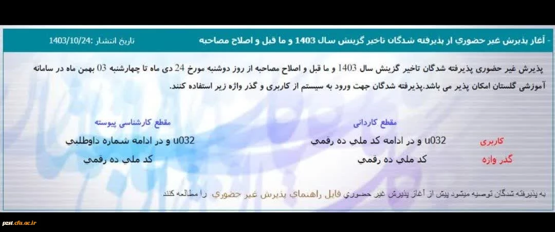 امتیاز دهید : آغاز پدیرش غیرحضوری از پدیرفته شدگان تاخیر گزینش سال 1403 وما قبل و اصلاح مصاحبه 2 دوشنبه 24 دی 1403 ساعت 21:28